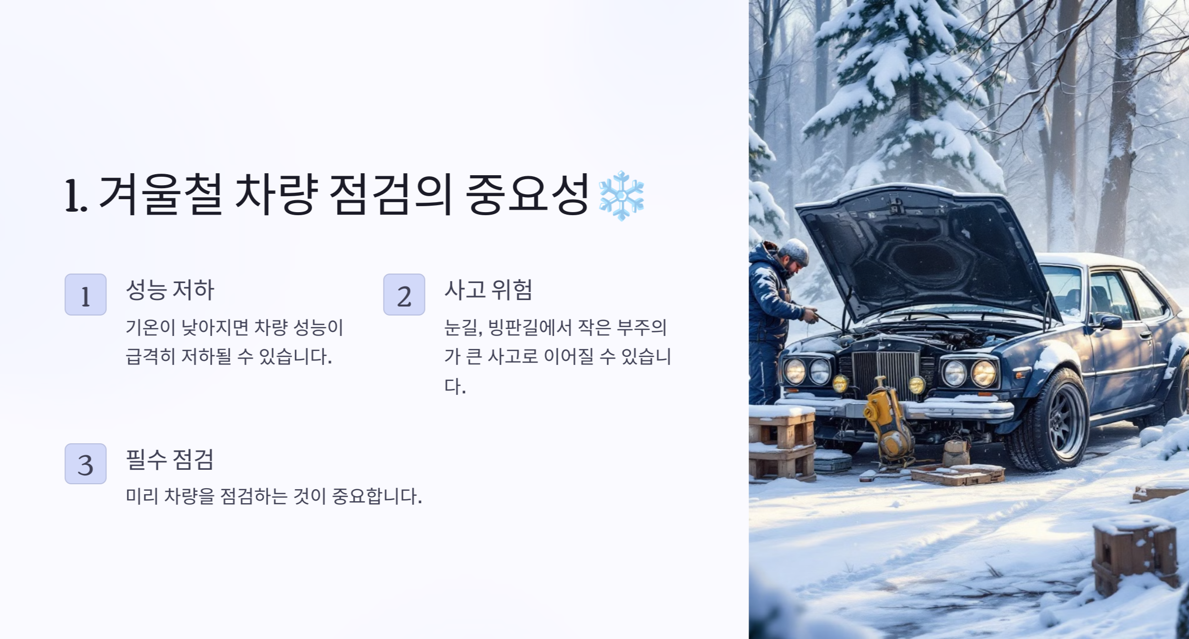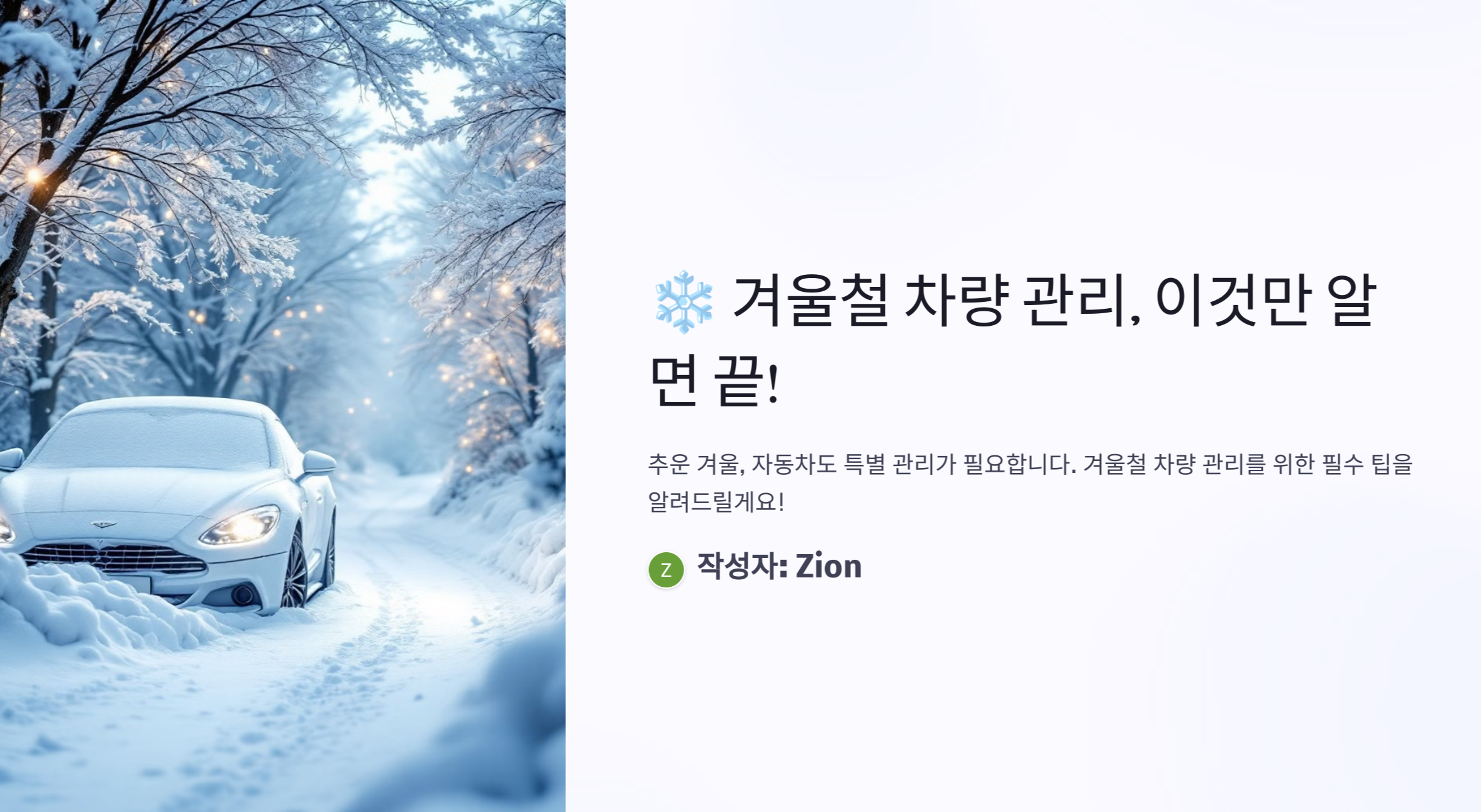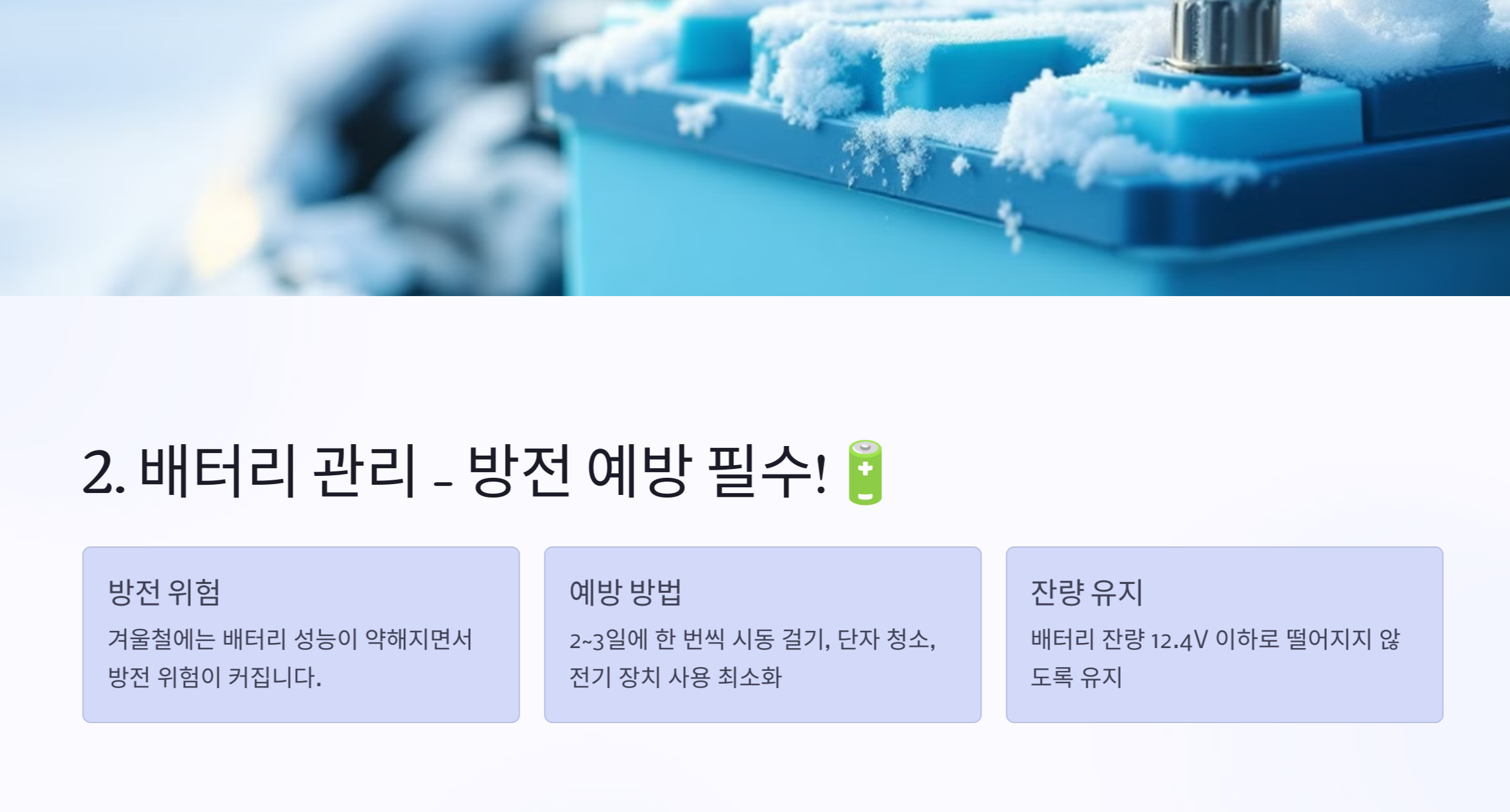 태그: 겨울철차량관리, 자동차점검, 배터리방전, 타이어관리, 스노우타이어, 부동액교체, 히터관리, 워셔액, 안전운전, 자동차겨울준비